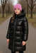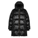 Mid-length puffer parka with zipper front closure and straight fit. Made with a nylon luster shell, features two outer pockets and one inner pocket. Length: 35" from high shoulder point.