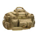 Heavy duty duffle constructed in heavy polyester with upgraded webbing, zipper, and buckles. MOLLE compatible on sides and front. Removable/adjustable padded shoulder strap. Top padded carry handle. Side buckled compression straps can be used to secure extra gear. 3D rings on front. Embellish able front hook and loop patch. Large, top loading zippered main compartment is highly water resistant. Rigid base board holds duffle shape and protects base fabric. Top zippered compartment. 2 zippered front pockets, 2 buckled front pockets, 4 zippered side pockets, 5 bottom feet support and protect bottom fabric from abrasion and moisture.