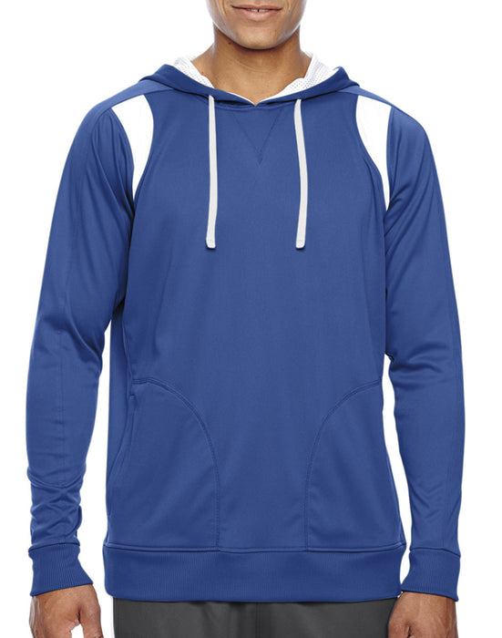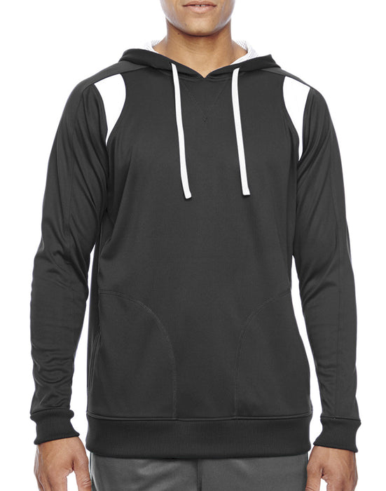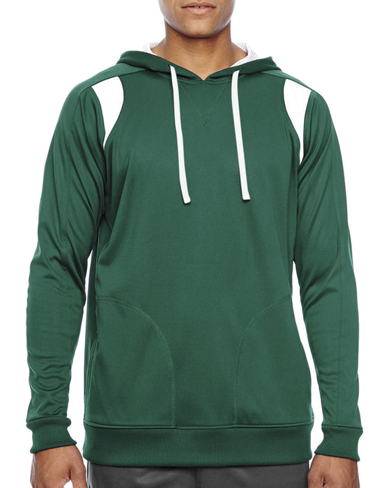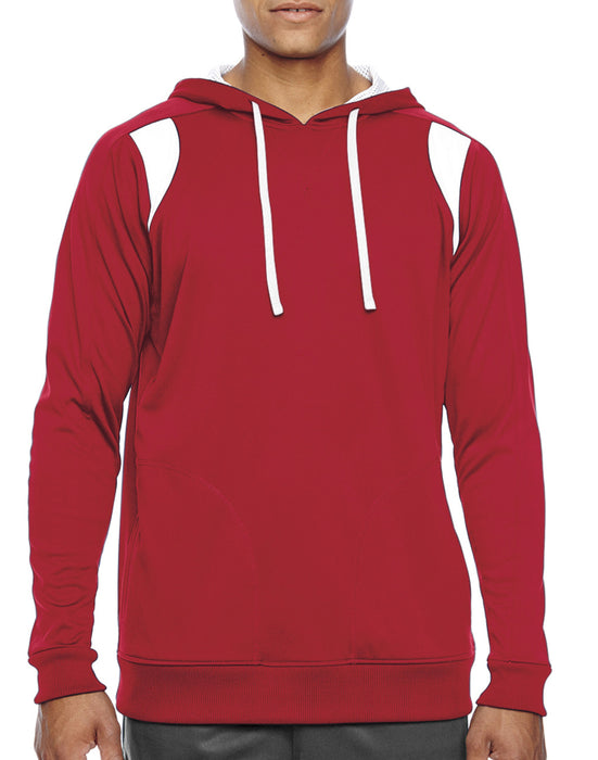 Contrasting arm stripes, neck placket and inside of hood. Lace-up neck line with hockey style two-tone lace. Front pouch pocket, relaxed athletic cuffs and band bottom, double ply hood.