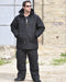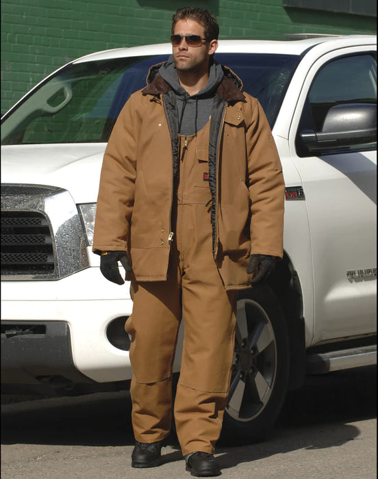 12oz 100% cotton tough duck fabric, quilted 8oz polyester insulation lining. Laydown corduroy collar, removable and adjustable hard hat hood, knit storm cuffs, four large scoop pockets, inside draw string waist.