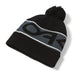 Fine gauge knit. Jacquard logo, cuff fit with pom. 100% acrylic