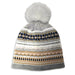 Acrylic knit beanie with design print. Faux fur pom.