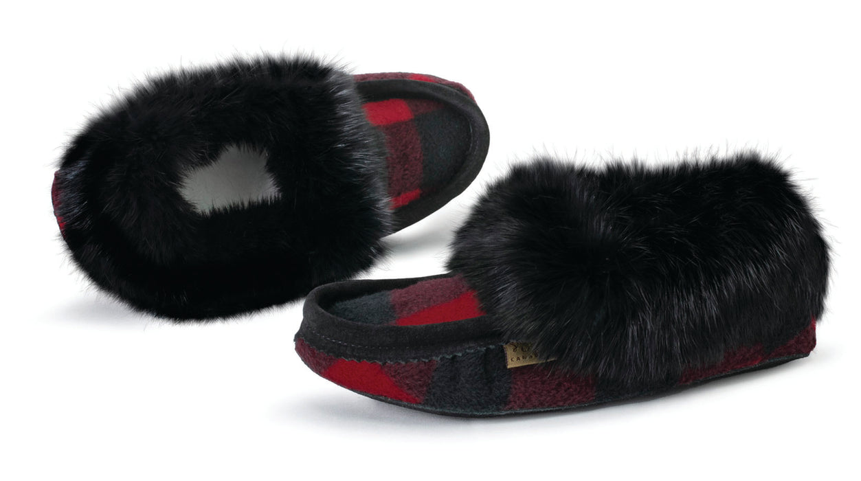 These women's fur trimmed moccasins will keep your feet cozy and warm. These moccasins are handcrafted and are trimmed in rabbit fur. They feature a buffalo plaid pattern made of wool and are lined with Orlon Lining for warmth.
