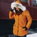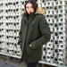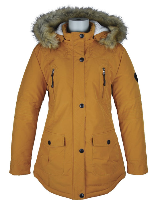 Polyrock Oxford outer fabric with waterproof coating. Sherpa fleece and quilted lining, heavy polytek fill. Detachable hood and faux fur trim, two front zip pockets, two front pouch pockets with button closure, drawstring adjustable waist.