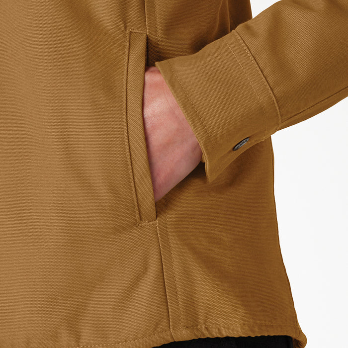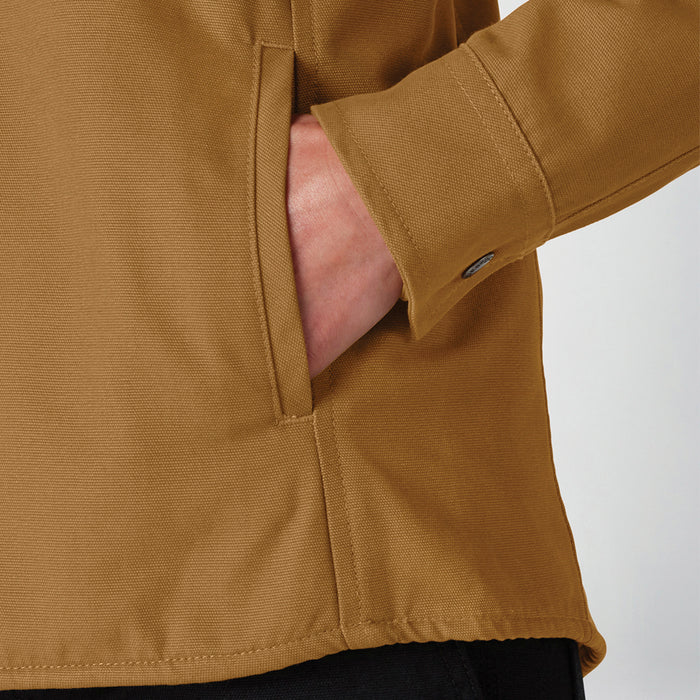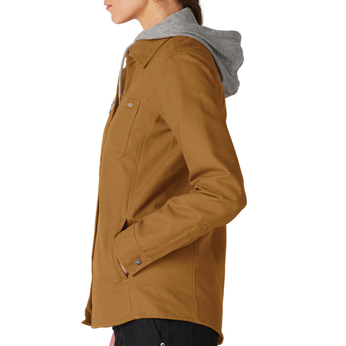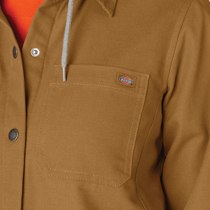 Discover the most versatile outer layer that delivers on the promise of warmth, durability and protection in Dickies Women’s Duck Hooded Shirt Jacket. Combining the lived-in feel of a hoodie, the strength of a duck canvas work shirt and the security of a jacket, this workday essential will check the box for function and style. Featuring a sturdy brushed duck canvas fabrication and equipped with a cozy jersey lining and hood, you’ll embrace the cold climate with ease in this shirt jacket. You’re covered in wet weather too, as the DWR finish ensures water repellency to keep you dry. Durable metal snap closures at front and a drop tail hem offers even more protection when your work climate calls for it. Maximum utility comes standard with two large chest pockets and two side welt pockets to store all that you carry.