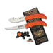 Lightweight, field-to-freezer combo with the two perfect blade designs for skinning and deboning big game, plus a ceramic/carbide sharpener to maintain a razor-sharp edge at all times. The 4.0 inch deep bellied gut-hook skinner removes hide quickly and opens game like a zipper without piercing vital organs. The 5 inch boning knife is ideal for breaking down any animal to family sized portions. 420J2 stainless steel blades are precisely heat treated to hold a great edge, and are hand finished shaving sharp. Rubberized, blaze-orange TPR handles offer high visibility in the field and ensure a nonslip grip, even when wet. Additionally, the elk horn inlay provides extra indexing points for greater control, and prevent fatigue during long use. Comes complete with a Kryptek Highlander nylon sheath with snap-in knife scabbard for easy removal and cleaning.