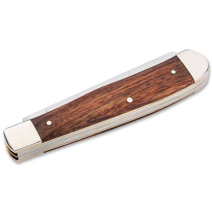 The Boker Traditional Series 2.0 takes the transient out of time and is the answer to yesterday for tomorrow. Equipped with a drop-point and a sheepsfoot blade, the Boker TS 2.0 Trapper is more flexible in everyday use than almost any other knife. The non-stainless 1095 carbon steel is characterized by excellent sharpness and easy resharpening. The pocket-knife is opened with the customary a nail nick, while the slipjoint mechanism holds the blade with full spring tension. For a traditional touch, handle made of brown rosewood is framed by nickel silver bolsters at both ends of the handle and is stylishly accentuated by three rivets. Timelessly beautiful and shaped by tradition.