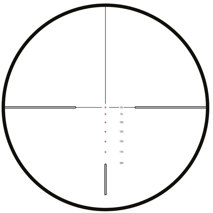 Bullet Drop Compensating (BDC) aim points calculated for your specific caliber. Designed for .22 LR High Velocity. Zero on 16x magnification at 50 yards and the bullet drop compensating reticle provides accurate aim points in 25 yard increments out to 200 yards. Ideal for .22 LR ammunition between 36-40gr and approx. 1235-1260 fps (376-384 m/s). Can also be accurately calibrated for standard velocity and sub-sonic ammunition. The scope can also be used for 50m zero with aimpoints correct in metric when the magnification is set to 13.9x.