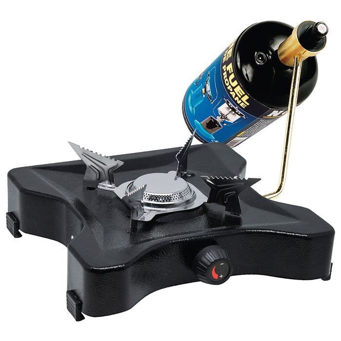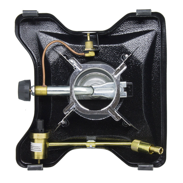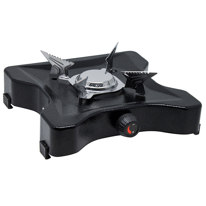 This single burner propane stove is made from stainless steel, featuring a 8200 BTU burner with an adjustable flame control knob. The durable powder-coated steel frame and ABS support feet provide stability, while the included brass LP regulator and burner grate clip make for easy storage.