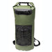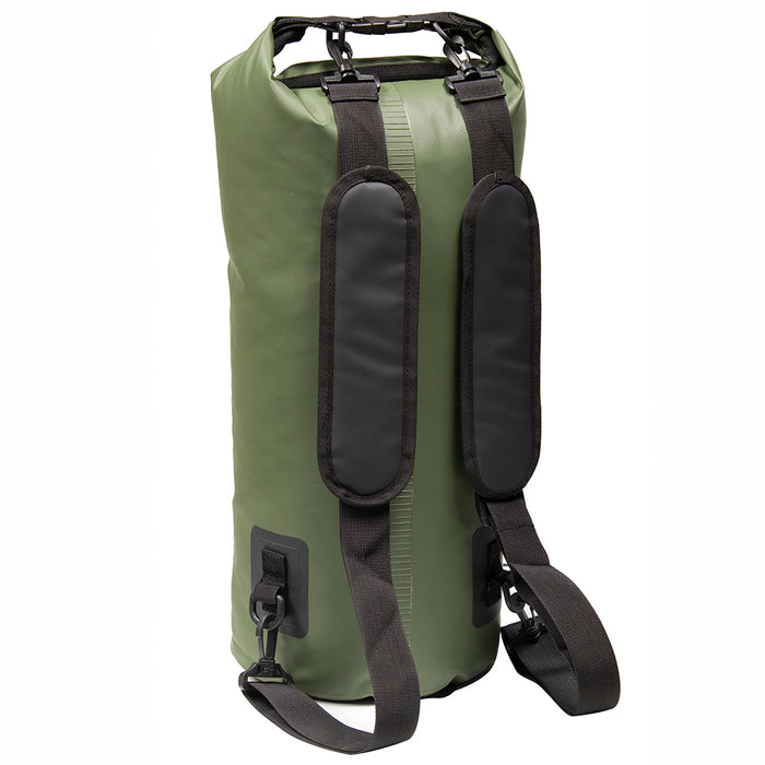 Waterproof heavy gauge PVC coated fabric is tear abrasion and puncture resistant. Fold down top closure with quick-release buckle. Removable adjustable length shoulder straps configure to backpack, sling, or duffle.
